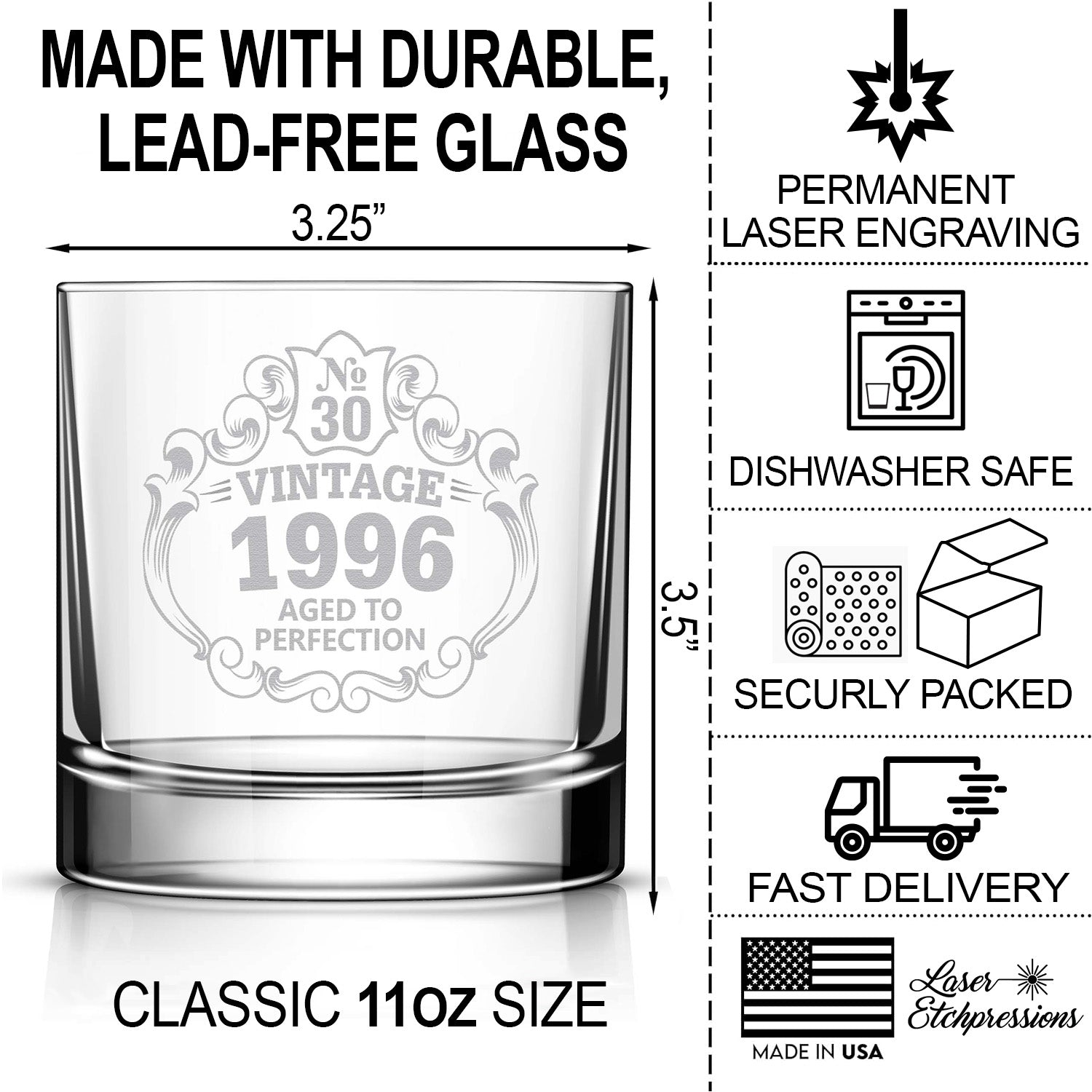 30th Birthday Engraved Whiskey Glass, Custom Engraved Rocks Glass, Vintage 1996 Aged to Perfection 11oz Old Fashioned Cocktail Glass