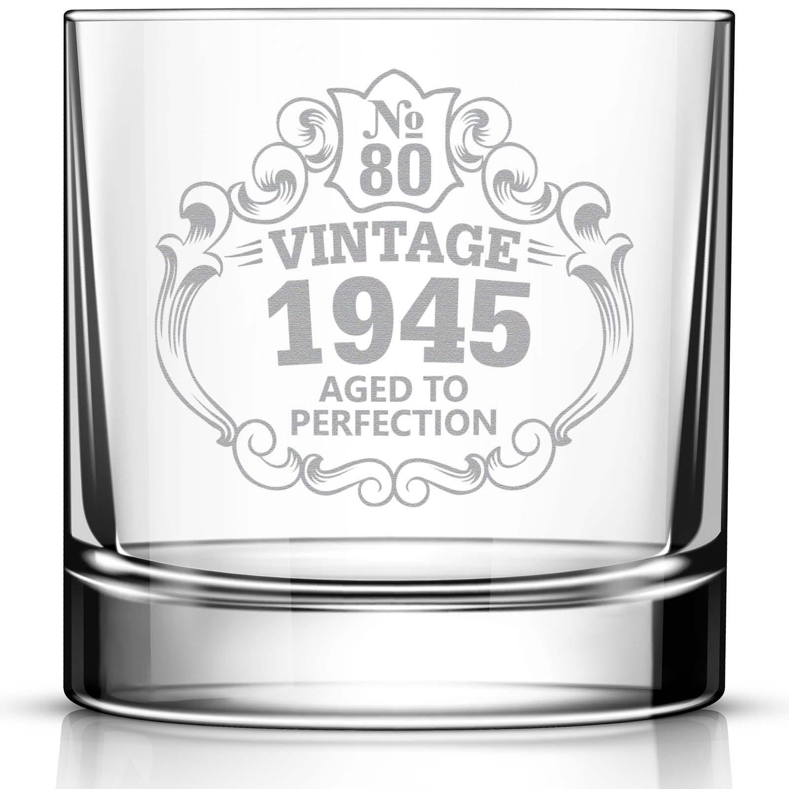 80th Birthday Engraved Whiskey Glass • Custom Engraved Rocks Glass • Vintage 1945 Aged to Perfection 11oz Old Fashioned Cocktail Glass