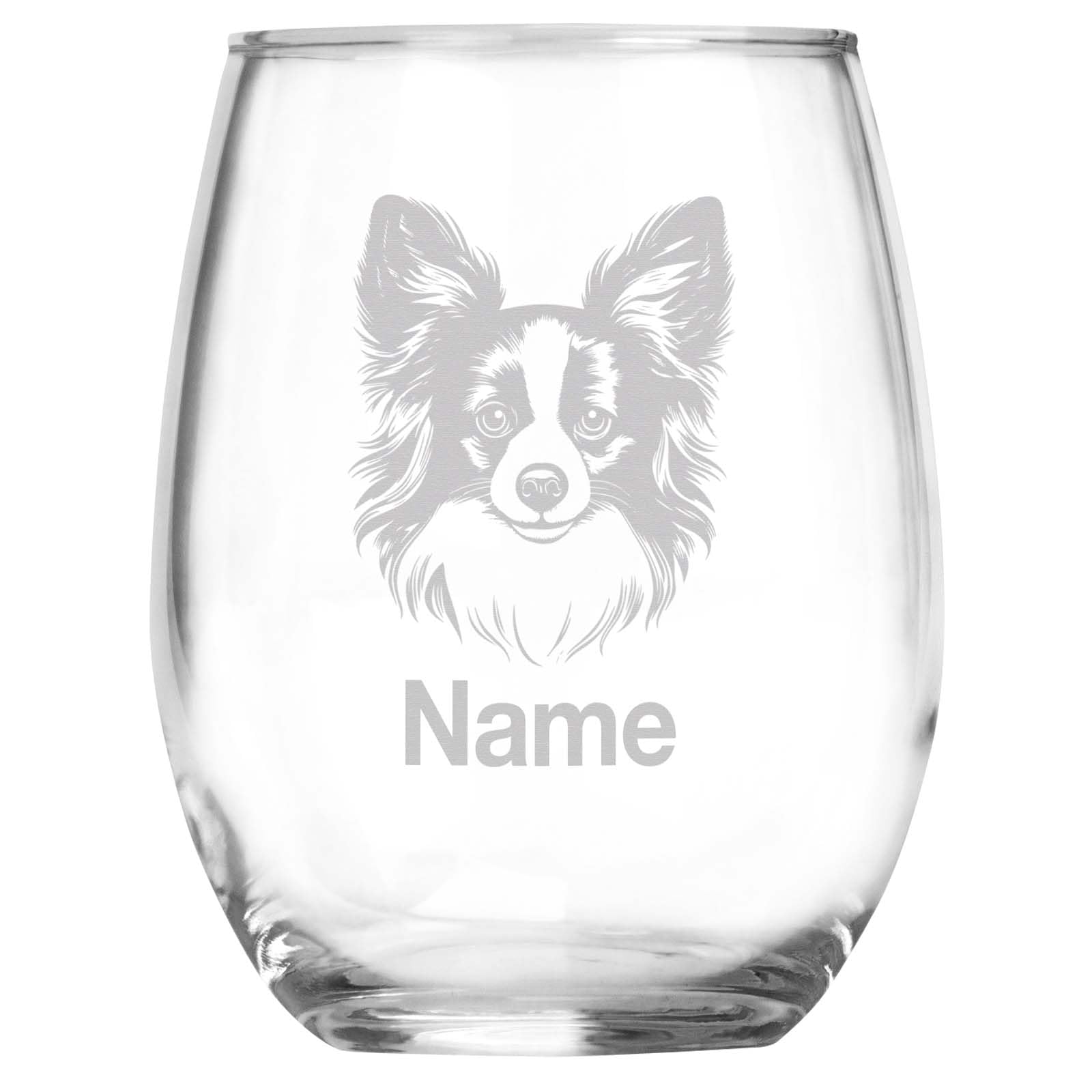 Celebrate Your Loyal Companion with a Personalized Papillon Wine Glass! Papillons are known for their playful personality, intelligence, and affection, making them one of the most beloved toy breeds. Honor your charming Papillon with a beautifully engraved stemless wine glass, featuring a detailed Papillon head portrait and a custom name of your choice. This personalized keepsake captures the breed's graceful and lively features, making it a perfect tribute to your joyful companion. Crafted from high-quality glass, this 15oz stemless wine glass is ideal for any occasion, whether sipping wine, cocktails, or simply enjoying a cozy drink. The laser-etched engraving will remain vibrant for years to come. Celebrate your Papillon's spirited and loving nature with this custom keepsake!