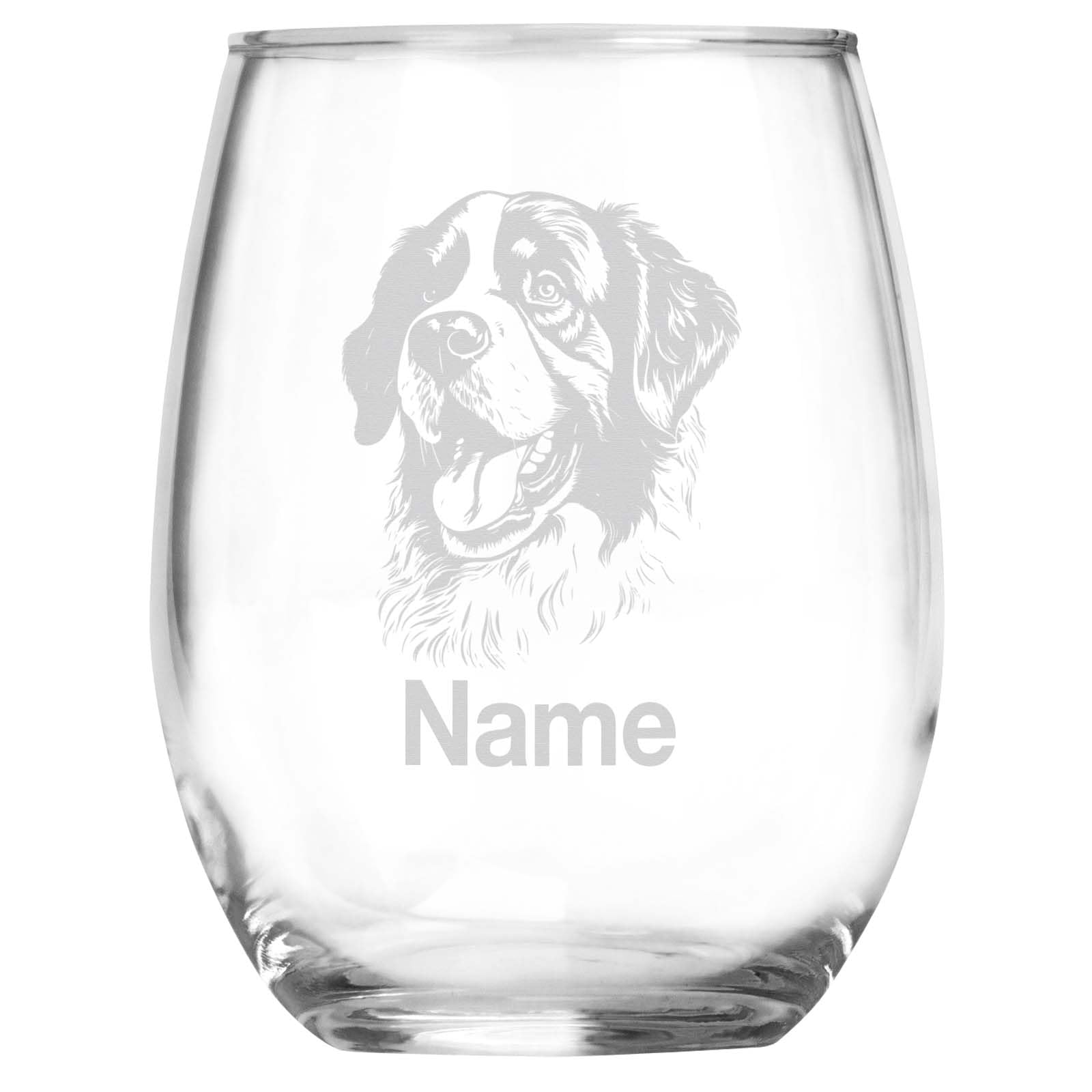 Personalized Saint Bernard Breed Themed Stemless Wine Glass with Custom Name, Engraved Dog Lovers Gift, Unique Pet Owner Keepsake for Dog Mom or Dad